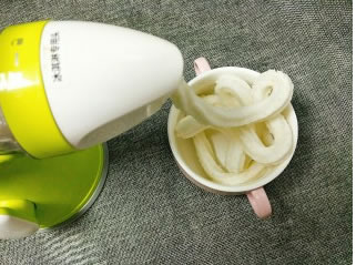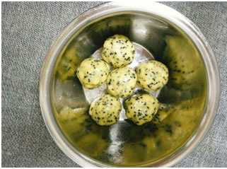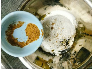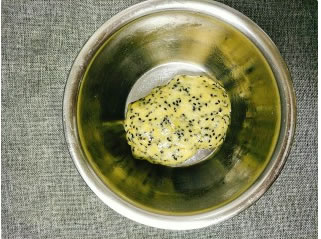 3、摇好的米饭,倒入玉米油,鸡蛋液,黑芝麻,面粉,盐,五香粉,