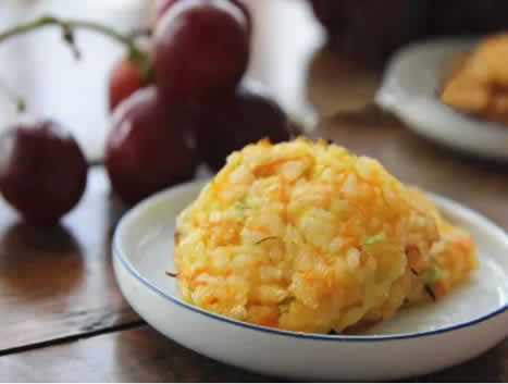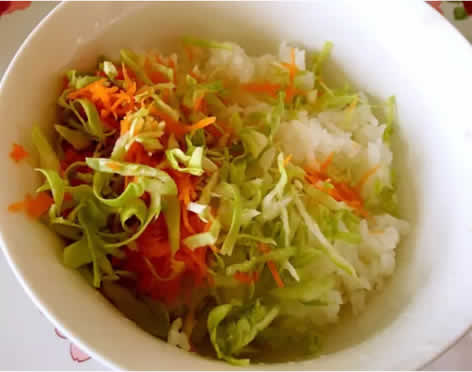 3 胡萝卜擦丝、圆白菜切细丝,白米饭放在一起