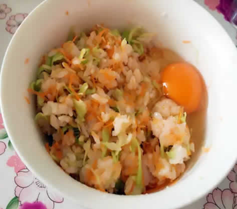 米饭煎饼:将胡萝卜擦丝、圆白菜切细丝,白米饭放在一起,加一个鸡蛋搅拌匀,加入盐和香油调味拌匀。取一些拌好的饭团成团后,压成小饼放入油锅中,煎至金黄就好了。这样做起来很适合不爱吃菜的宝宝们