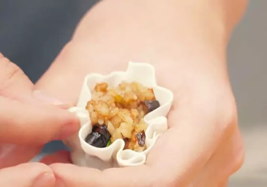 5、然后,馅心放在皮子中间,皮子花边调整一下,放置虎口处向上拢,同时糯米向下塞,捏出“花瓶状”即可,皮薄馅多的烧麦完工~