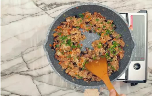 2、炒制糯米馅,锅内倒入素油、猪油,加入葱段、姜片爆香,捞出后加入夹心肉末、香菇(松子、笋丁等),肉末扁白后,加入白胡椒粉、料酒、糖(多)、盐(少许)、酱油(大量),炒制沸腾后关火,加入鸡精、味精、芝麻油,之后加入糯米,拌匀,糯米吸收汤汁;