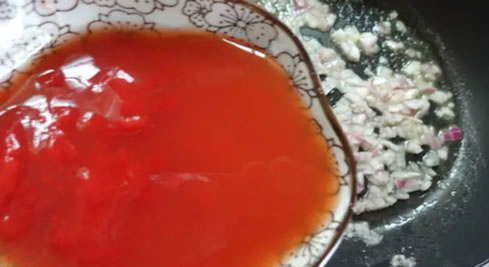 第四步,锅中加入之前备好的番茄沙司汁,加入1勺黑胡椒,煮开搅匀后关火。