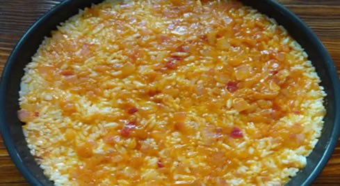 第六步,准备好披萨盘,先用硅胶刷将加热后的黄油均匀的刷到披萨盘内,接着倒入米饭,用小勺或者锅铲将米饭压紧实,然后把炒制好的番茄酱汁倒在米饭上面,并用硅胶刷涂抹均匀。