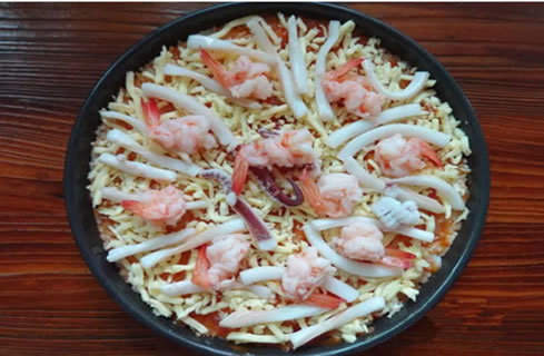 第七步,番茄酱抹匀后,往米饭上均匀的撒上马苏里拉奶酪,并摆放好虾仁和鱿鱼。接着放入预热200度的烤箱中层,烤15分钟。具体的时间和温度可以根据自己的烤箱来调整。