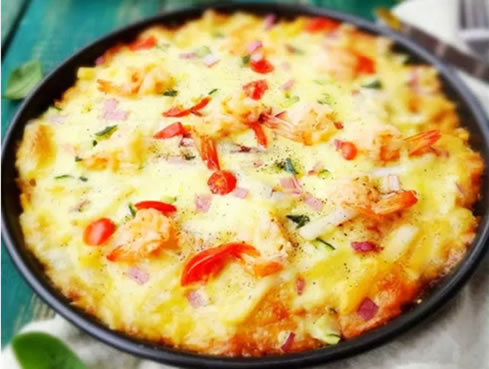 第八步,时间到,将披萨取出后再撒上一层马苏里拉奶酪,接着撒上准备好的洋葱丁、黄瓜丁、番茄块和少于胡椒粉。然后,再次放入烤箱,同样温度烤5分钟即可,酥香可口的米饭披萨制作完成了,快点食用吧。