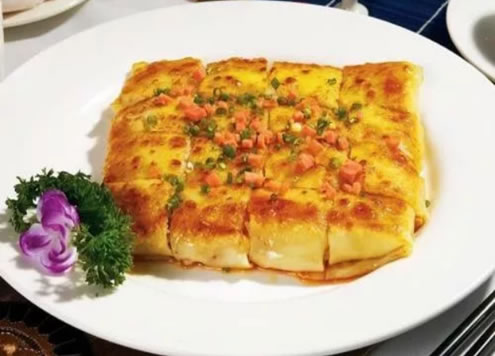 5、沿豆皮边淋入猪油,提高炉温煎一会,边煎边切成小块,再浇入猪油45克,起锅即可.