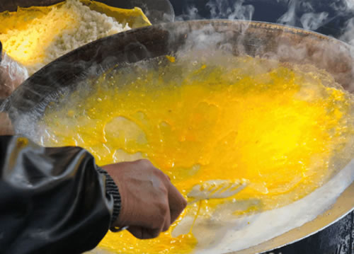 4、将豆面浆在煎锅中摊成皮,打入鸡蛋涂匀,盖锅盖。烙成熟皮。用铲子将皮四周疏松,翻面后撒盐10克,把糯米倒入铺平,在半边撒馅料铺匀,对折糯米和浆皮。