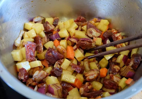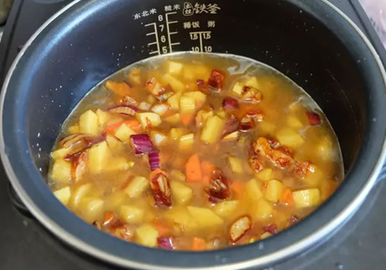 4、把拌好的食材放进米上铺平,倒进适量的清水,水量跟平时做饭的水量差不多就可以了;