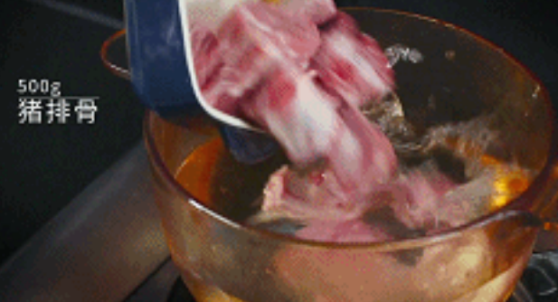 锅内加清水,倒入500g猪排骨、1片生姜,大火将水烧开,去除血水,变色后捞出;